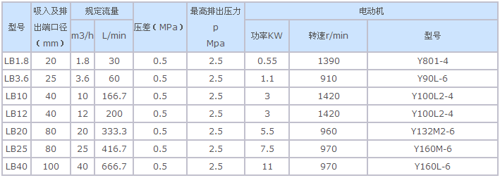 LB型冷凍機用齒輪泵性能參數 及配套電機。